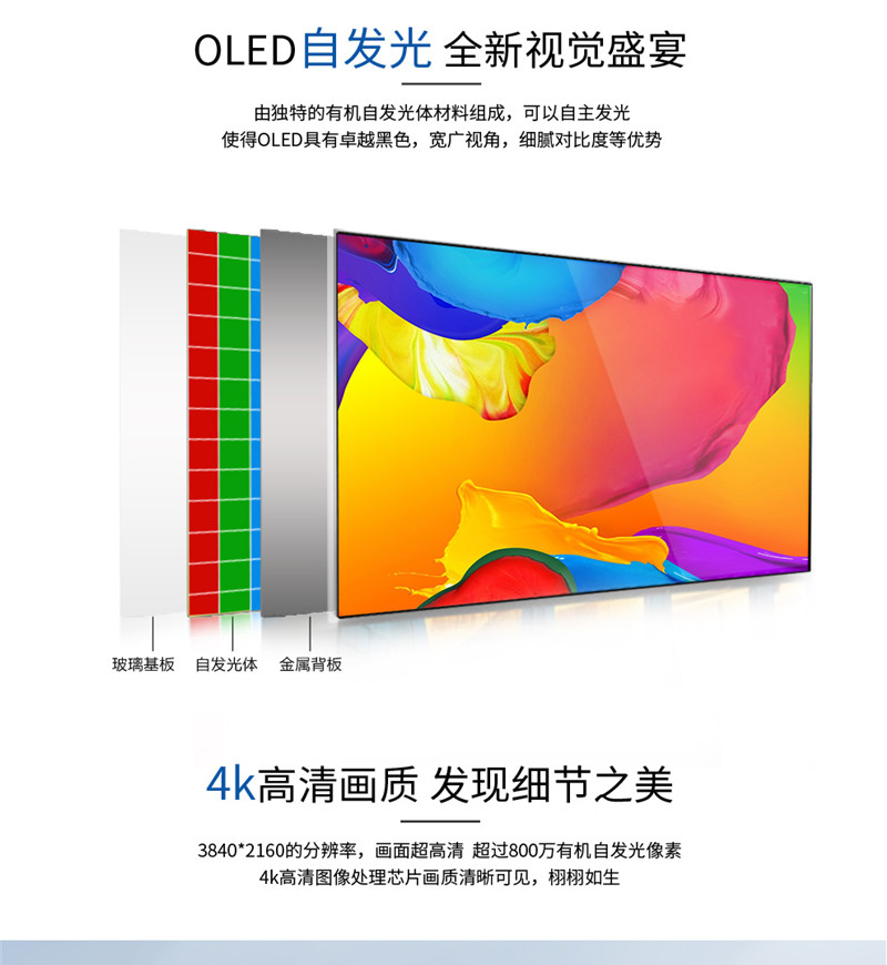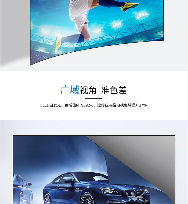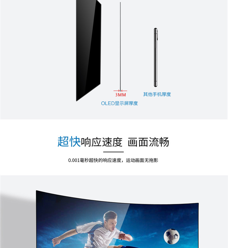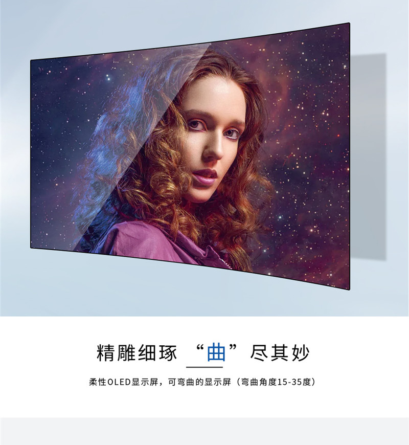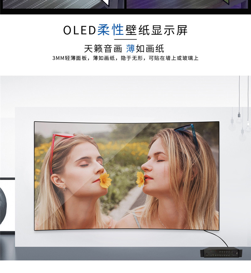 自发光显示技术,800万自发光像素 3MM超薄面板,可贴墙上或玻璃上 4K高清3840*2160 柔性OLED显示屏,可弯曲的显示屏 广色域,色域值NTSC92% 0.001毫秒超快的响应速度,画面无拖影设计理念