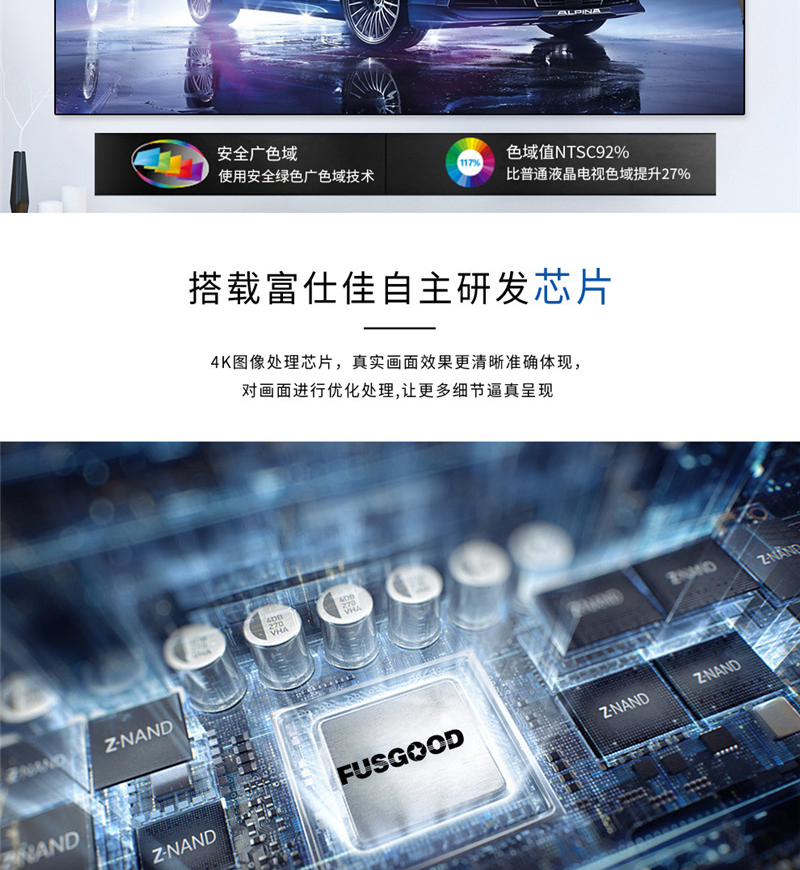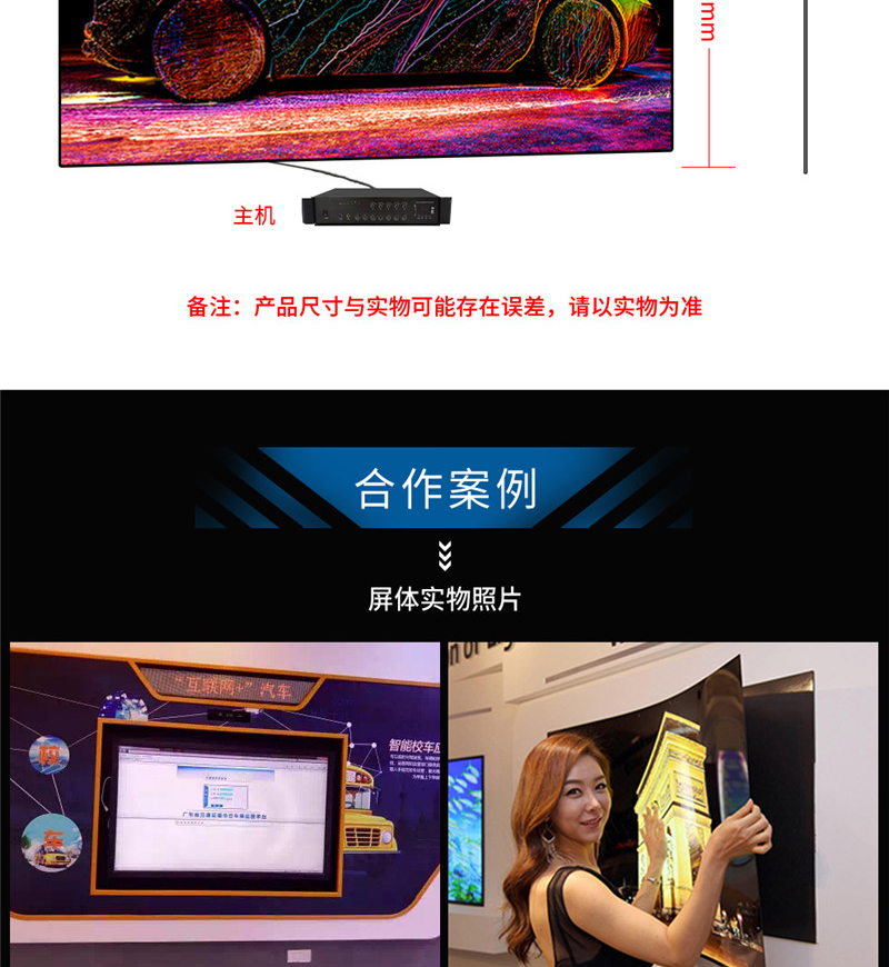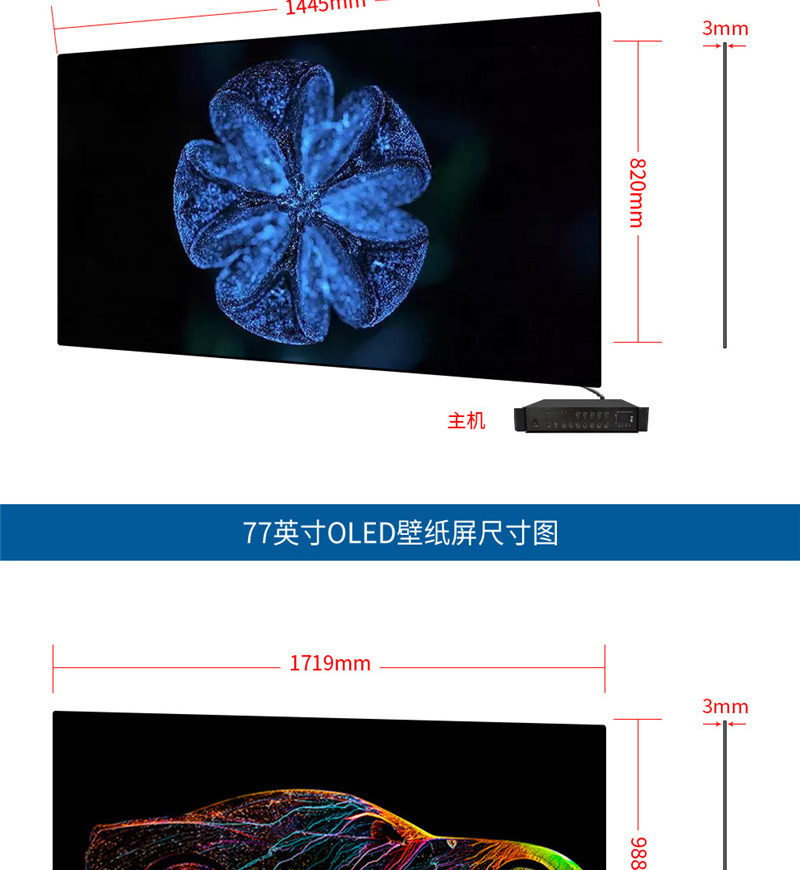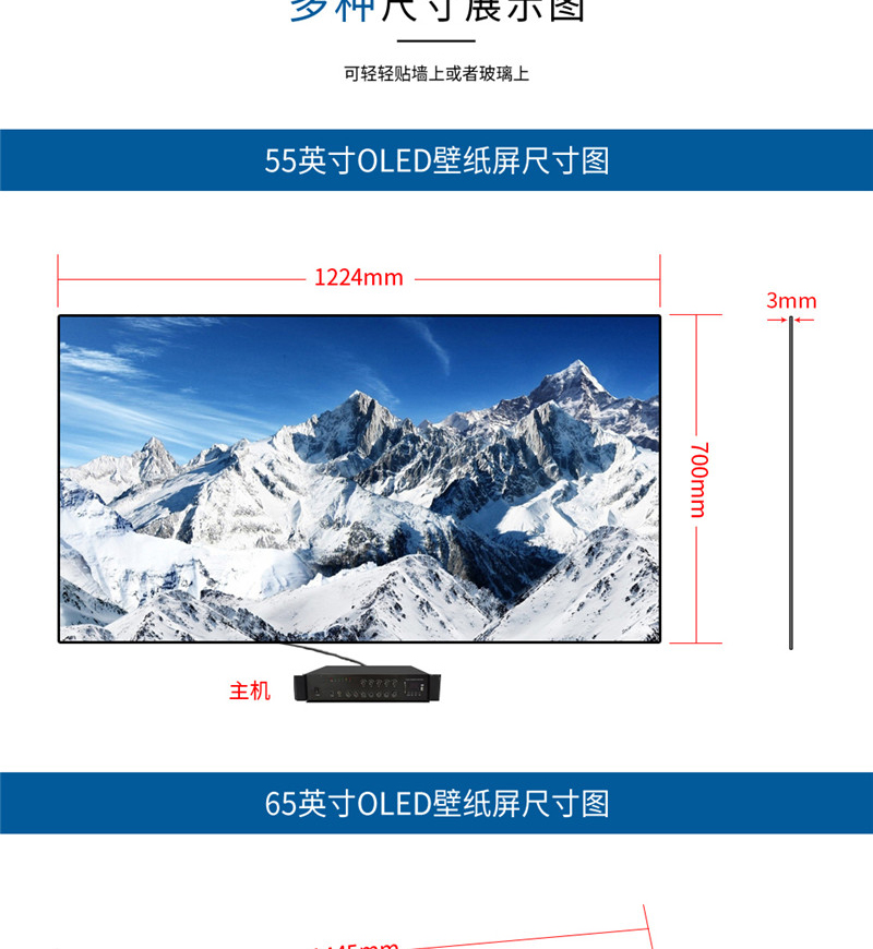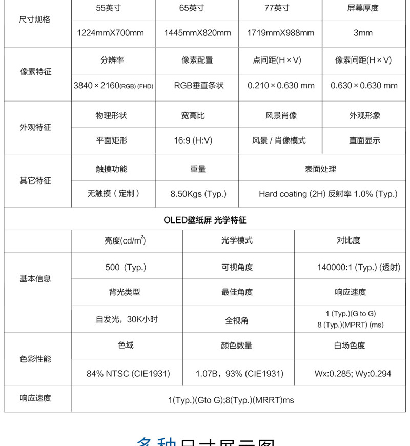 自发光显示技术,800万自发光像素 3MM超薄面板,可贴墙上或玻璃上 4K高清3840*2160 柔性OLED显示屏,可弯曲的显示屏 广色域,色域值NTSC92% 0.001毫秒超快的响应速度,画面无拖影设计理念